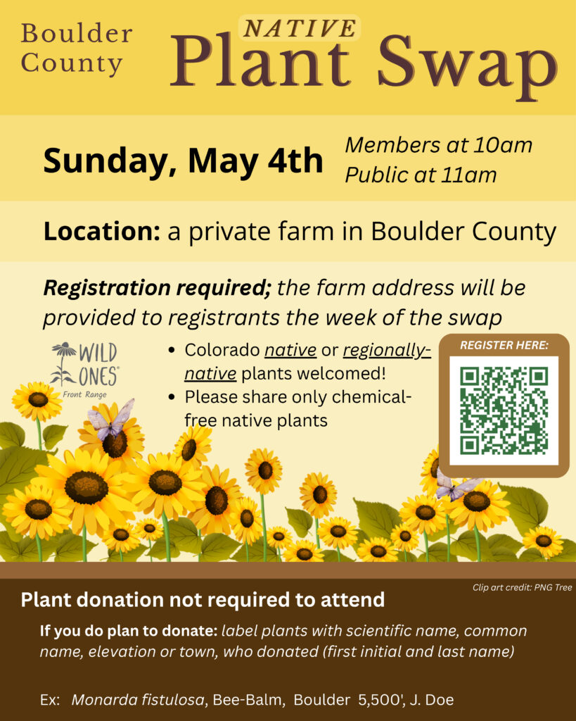 Wild Ones Front Range is hosting our 2nd Annual Boulder County Regional Native Plant Swap! All plants are grown by volunteers and community members; plant stock isn’t commercially grown.