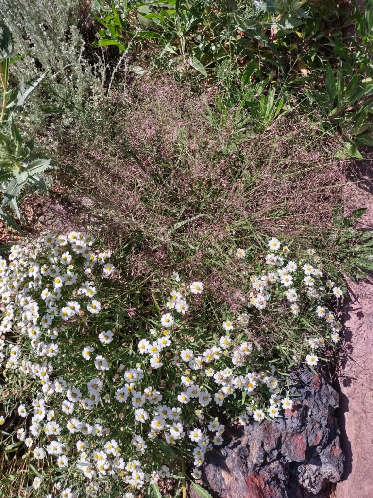 - Eragrostis spectabilis (purple lovegrass) and Melampodium leucanthum (blackfoot daisy) in mid summer